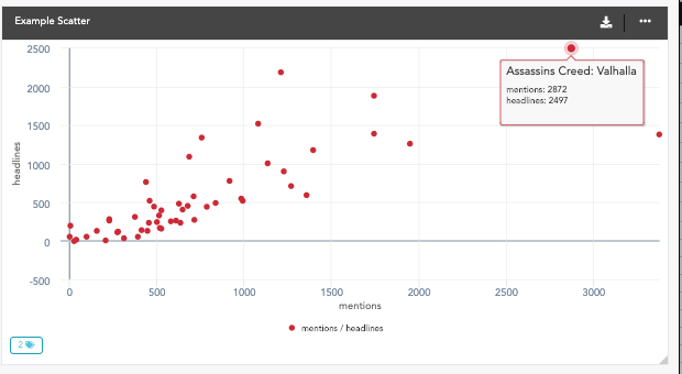 Bubble Chart - Compare 3 different metrics on one graph, this example shows number of views, number of videos and number of channels per product. The axis' show views and video count, while the size of the bubble indicates number of channels. Placing the cursor on the bubble shows all the information.