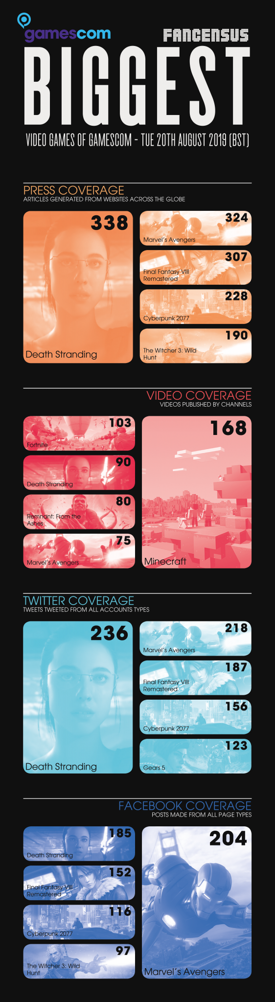 Death Stranding holds strong as day 2 of Gamescom commences with Gears 5 and Cyberpunk giving way to Marvel’s Avengers and Final Fantasy VIII Remastered in Press, Twitter and Facebook coverage. Minecraft remains on top of video coverage with the interest in the RTX Update carrying over to the second day.