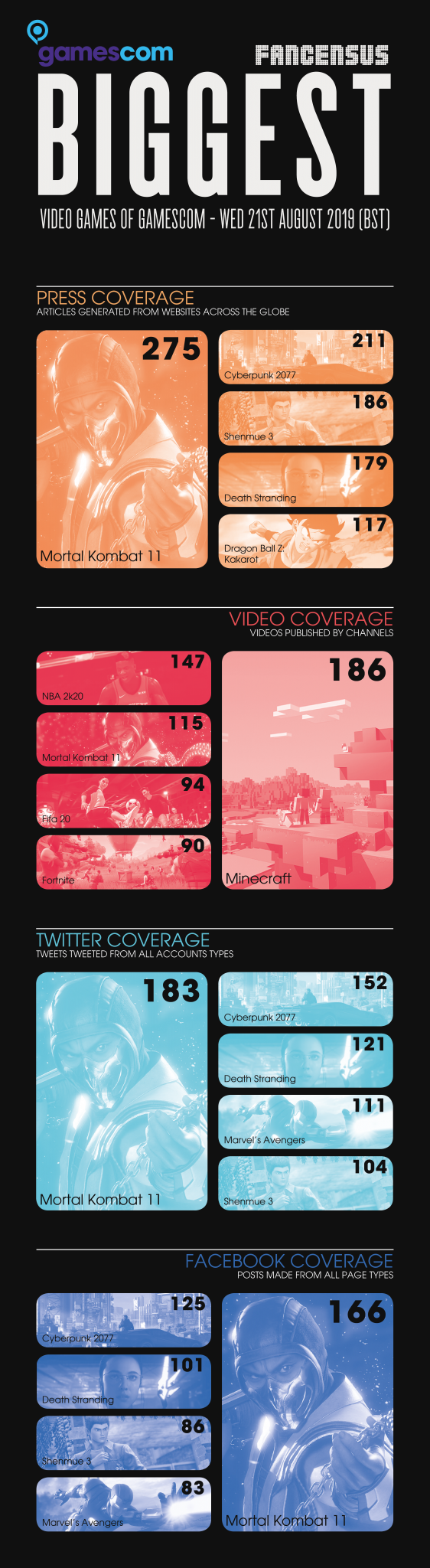 The newly announced fighters from Mortal Kombat 11’s Kombat Pack bring it to the forefront of the press, Twitter and Facebook coverage. Minecraft stays on top of the YouTube coverage whilst Shenmue 3 makes its way in to the press, Twitter and Facebook rankings after the release of a new gameplay trailer.