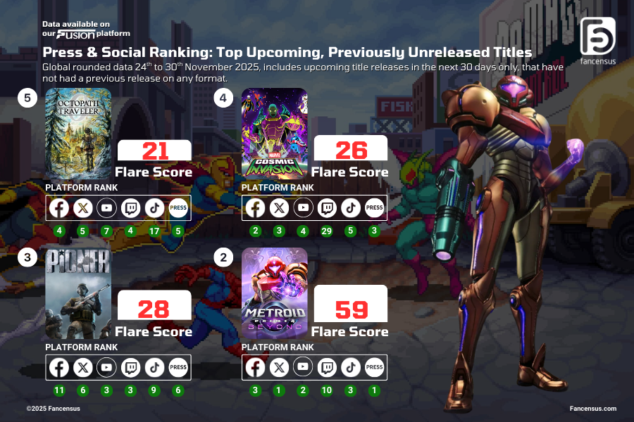 In fifth place Square Enix’s Octopath Traveler 0, the prequal to the original Octopath Traveler game, scored 21 in press & social media flare ahead of it's 4th December release. Press was focused on returning and new characters and fresh gameplay systems. GameSpot’s “Everything To Know” video gathered nearly 30k views, reinforcing that there is still healthy appetite for the series’ distinctive JRPG formula. Dotemu's Marvel Cosmic Invasion ranked fourth with 26, entering the market as a new Marvel beat‑’em‑up that released yesterday after a week of rising interest. Official gameplay and opening animation trailers on IGN’s YouTube channel pulled in around 200k and 500k views respectively, while a TikTok from Darthtanzo outlining its 15 playable characters approached 200k views. GFAGames' Pioner came in third with 28, building hype ahead of its 16th December early access release, fuelled by over 500k Steam wishlists, an IGN‑featured trailer, and a million‑view YouTube video from Вестер discussing regional blocking. Dropping from first place last week Nintendo's Metroid Prime 4: Beyond scored 59, second place overall but still holding the top spot in the press and on X as new details and the “Survive” trailer trickled out. Nintendo’s acquisition of Bandai Namco Studios Singapore, the team behind the original Metroid Prime 4, added another layer to coverage.