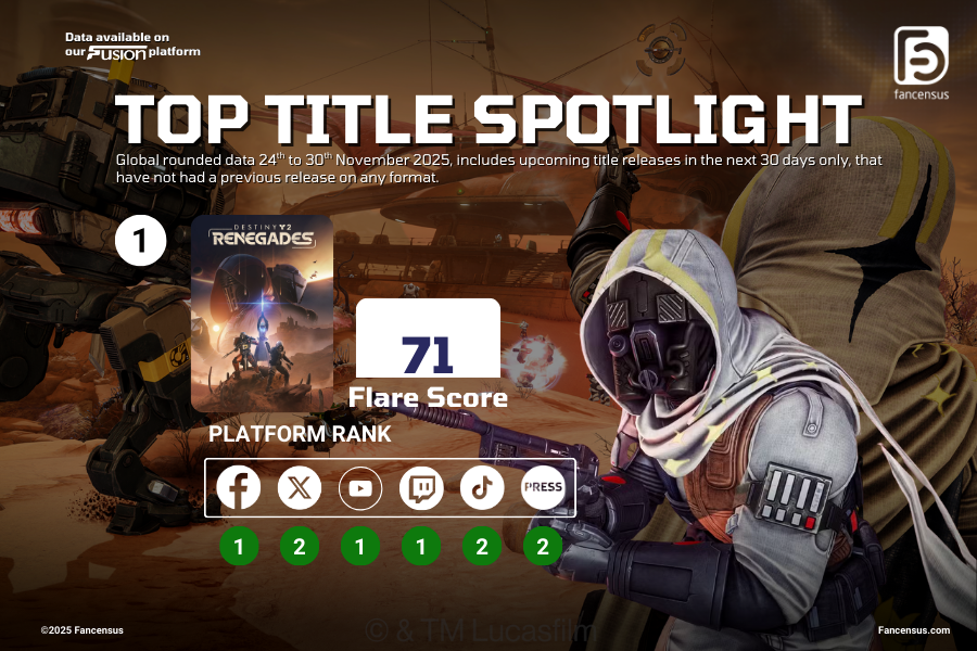 Press activity peaked on 26th November following the launch trailer drop on the 25th, with 149 headlines across 92 media sites. Most coverage revolves around three themes: the extent and execution of the Star Wars inspiration, the pressure on Renegades to re‑energise lapsed players after The Edge of Fate underperformed expectations, and the broader question of how long Destiny 2 can sustain its expansion‑driven model. Social activity also spiked on the 26th. On TikTok, Destiny 2’s own “Authentically Destiny. Unmistakably Star Wars.” clip cleared 250k views, while Bungie’s developer livestream on Twitch drew more than 200k viewers. Interestingly, the most‑watched YouTube content was not the official trailer but Mr. Fruit’s “The brutal truth about Destiny 2 Renegades,” in which the creator shared hands‑on impressions from a visit to Bungie HQ. Signaling how influential honest creator commentary remains for live‑service expansions.