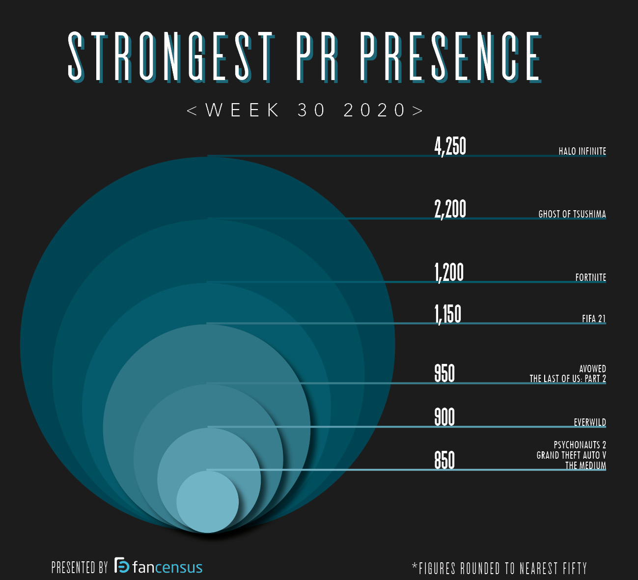Fresh off the back of the Xbox Games Showcase it’s of no real surprise to see Halo Infinite grabbing the number one spot in the Week 30 Strongest PR Presence top ten. The biggest subject covered when discussing the next Halo outing was Xbox Games Showcase July at 17%. Up next it was Gameplay with 13.3% as articles discussed what took place in the first reveal of Halo Infinite gameplay footage. Announcement was the third most discussed topic at 10.2% a lot of the articles under the Announcement topic spoke about the Games Showcase overall and mentioned Halo Infinite alongside newly announced titles. Ghost of Tsushima has maintained a spot in the top ten for a few weeks now, in week 30 it made it into second. Just a week after its launch the title acquired coverage in typical areas one would expect, the breakdown looked like this; 23.3% Sales/Player Numbers, Guide/Walkthrough at 14.8%, Launch Details with 6.9% and then Leak/Spoiler/Rumour/Speculation at 6%. Up in third in week 30 was Fortnite. Obviously, it doesn’t matter what is happening in the wider world or in the gaming world, Fortnite always remains a constant. The most covered topic for Fortnite was DLC/Content Update at 12.1%. Up next was Guide/Walkthrough with 8.3%, these articles were similar to the usual Fortnite content and provide players with instructions for completing in game challenges etc. Game Components followed at 7.6%, a lot of the articles under this topic were about ancient astronaut themed challenges which appear to be making their way to the famed Battle Royale. Evergreen sporting sim, Fifa 21 was able to snag the number 4 spot as new details about this year’s return to the field became available to the digital footy fans. A new trailer dropped showcasing what’s to be expected from the next title in the series and also confirmed suspicions of French player Mbappe being the cover star, the Trailer topic therefore made up 20.9% of the game’s total coverage. A flurry of screenshots also came out with the trailer which led to a 18.9% chunk of the game’s PR coming under the Screenshots/Artwork topic. The news that this reveal would take place and the subsequent Mbappe news meant that the Announcement topic was worth 14.5%. Newly announced and therefore a new addition to the top ten was fifth placed, Avowed. The Obsidian RPG got a surprise reveal at the Xbox Games Showcase and like Halo Infinite previously, its most talked about subject was Xbox Games Showcase July with 32.1%. Unlike Halo, however, there was no gameplay to be seen so the Announcement topic took second with 22.5%. As one might expect the Trailer subject was up next and for Avowed that was a 12.4% piece of the PR pie. The Last of Us: Part 2 continues to find itself in the Strongest PR Presence rankings and this time round the game grabbed the number 6 spot. A rather large 32.5% of the Last of Us 2 press came under the Sales/Player Numbers topic, the game continues to place well in sales top tens around the world. Up next was Launch Details at 10.2%, The Last of Us: Part 2 was mentioned within a range of articles some on the launch of the Playstation 5 and some others on the change in Metacritic’s user reviews rules put in place to prevent review bombing upon a games launch. The Storyline subject came up next with a smaller 4.4% as writer Neil Druckmann revealed he had planned to make the games story much darker early in its development. Another newly announced title from the Xbox event was Everwild, it made it into seventh in the Strongest PR Presence Top Ten. Like other games featured in the event, Everwild’s PR coverage fell under the following categories; Xbox Games Showcase July at 37.5%, Trailer with 26.1%, Announcement for 9.6% and then smaller chunks on a range of other topics starting with Launch Details at 3.3%. Psychonauts 2 despite previously being announced, also made an appearance at the Xbox Games Showcase and this exposure helped the title make it into eighth in week 30. Like Everwild, Psychonauts 2’s press coverage fell in the same pattern albeit in slightly different amounts. Xbox Games Showcase July as a topic made up 29.7% of the games press, Trailer sat at 21% after a rather psychedelic Gameplay Music Trailer was played for the viewing masses and then came Announcement with 7.5% for obvious reasons. No stranger to the Top Ten is Grand Theft Auto V, the seven-year-old title went from strength to strength in week 30 and made it into ninth. Bug/Issues/Patches/Updates was the most covered subject for the game as Rockstar announced upcoming updates for both GTAV and Red Dead Online, the subject accounted for 13.8% of the games PR. The Announcement topic made up 9.5% of the Grand Theft Auto V press again touching on the news about the upcoming updates. DLC/Content Update was up next with 8.5% where articles drilled deeper on the content teased by Rockstar. Finally, in at number ten, another Xbox Showcase title, The Medium. The Medium was another game which had been previously revealed but this time around we got to see a bit more of the title, this resulted in the Trailer topic being the most touched on at 21%. Xbox Games Showcase July was up next at 18.4% then followed Gameplay at 17.7% as The Medium showed of some of its unique gameplay elements whetting the appetite of the Xbox fans.