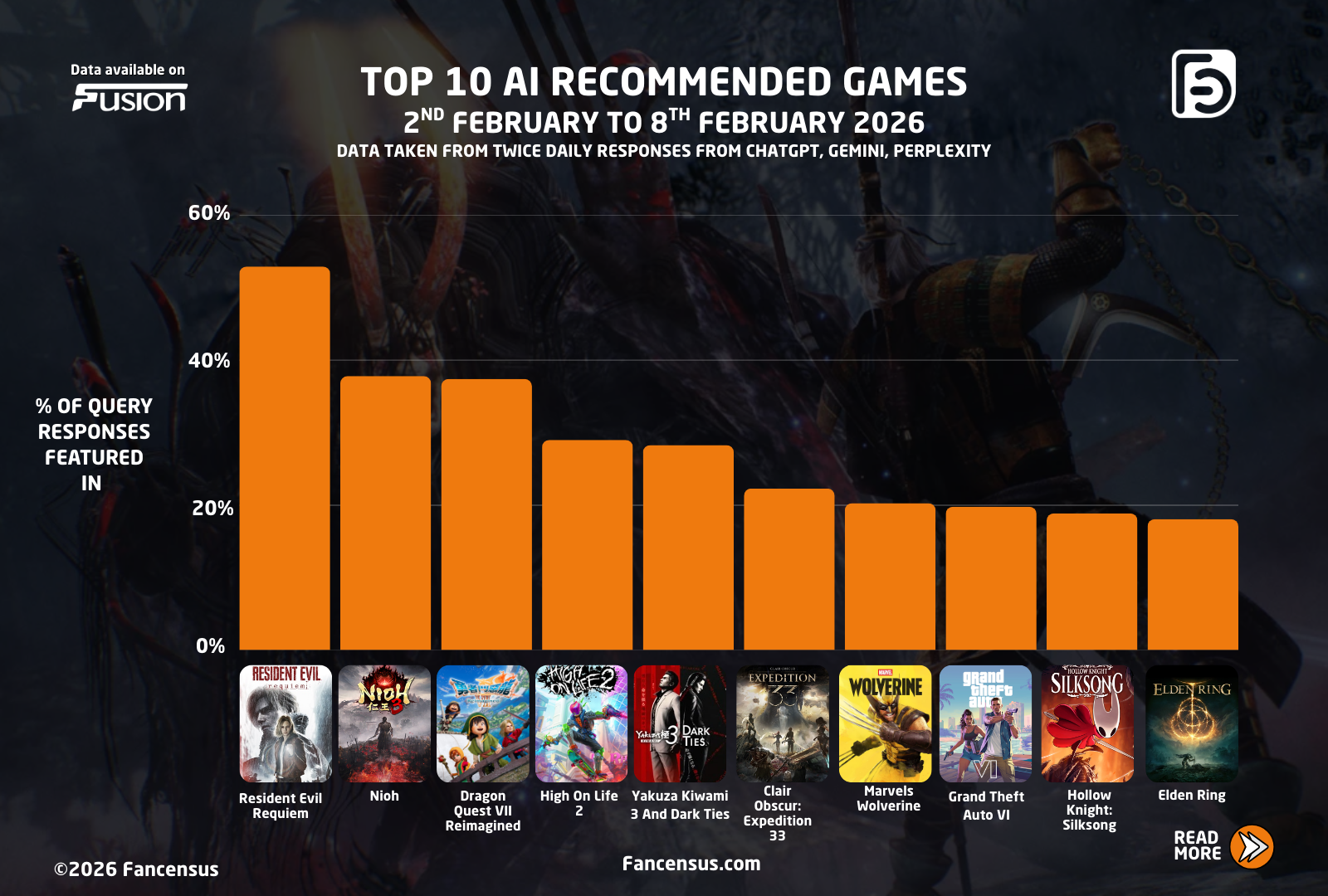 This week’s update shows Capcom's Resident Evil Requiem holding onto the top spot as the most‑recommended game overall for a second week running, while KOEI TECMO Singapore Pte Ltd's Nioh 3 has leap‑frogged both Requiem and the much‑anticipated Rockstar Games' Grand Theft Auto VI when the AI engines were specifically asked about new and upcoming titles.