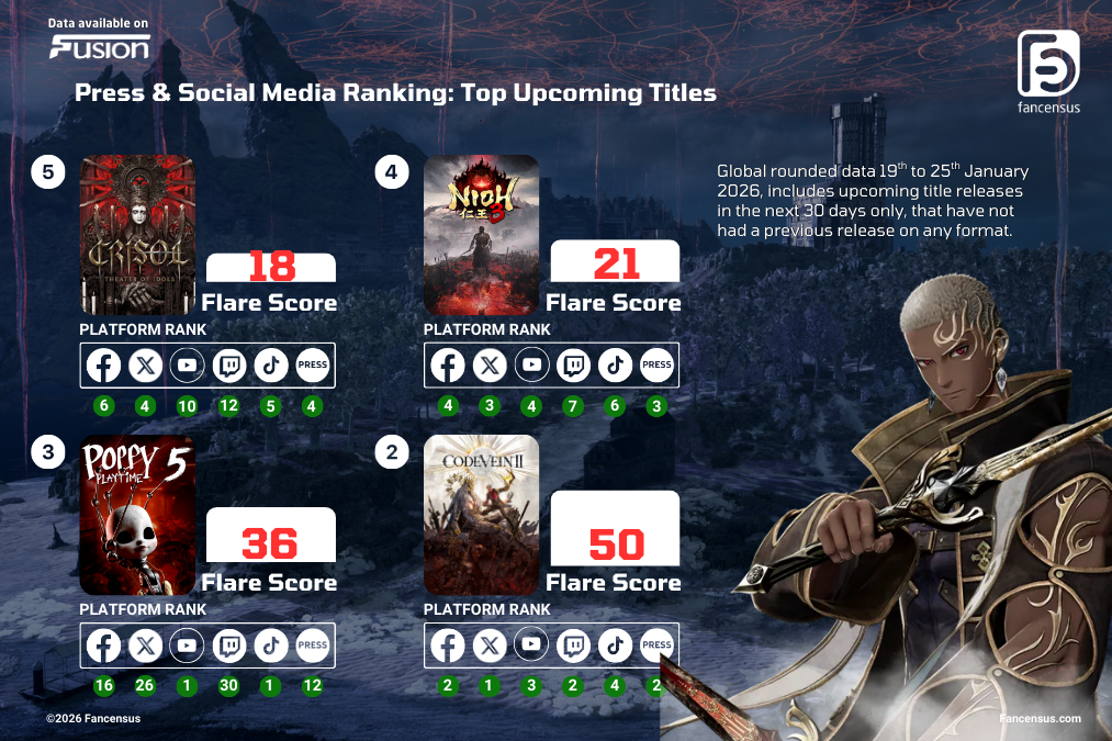Crisol: Theater of Idols announced its 10th February release date with a cinematic and gameplay trailer that pushed it into fourth place in press activity for the week. Notably, the version uploaded to the official PlayStation channels out‑performed both media outlets and Blumhouse Games’ own channel, underlining the power of platform‑holder amplification. Nioh 3 climbed thanks to a new 17‑minute gameplay video ahead of its 6th February launch, showcasing dual combat styles, fast ninja and slower samurai and newly open environments, while reassuring fans that major boss battles remain the series’ core. The IGN and Team Ninja Studio uploads each reached around 120k views.